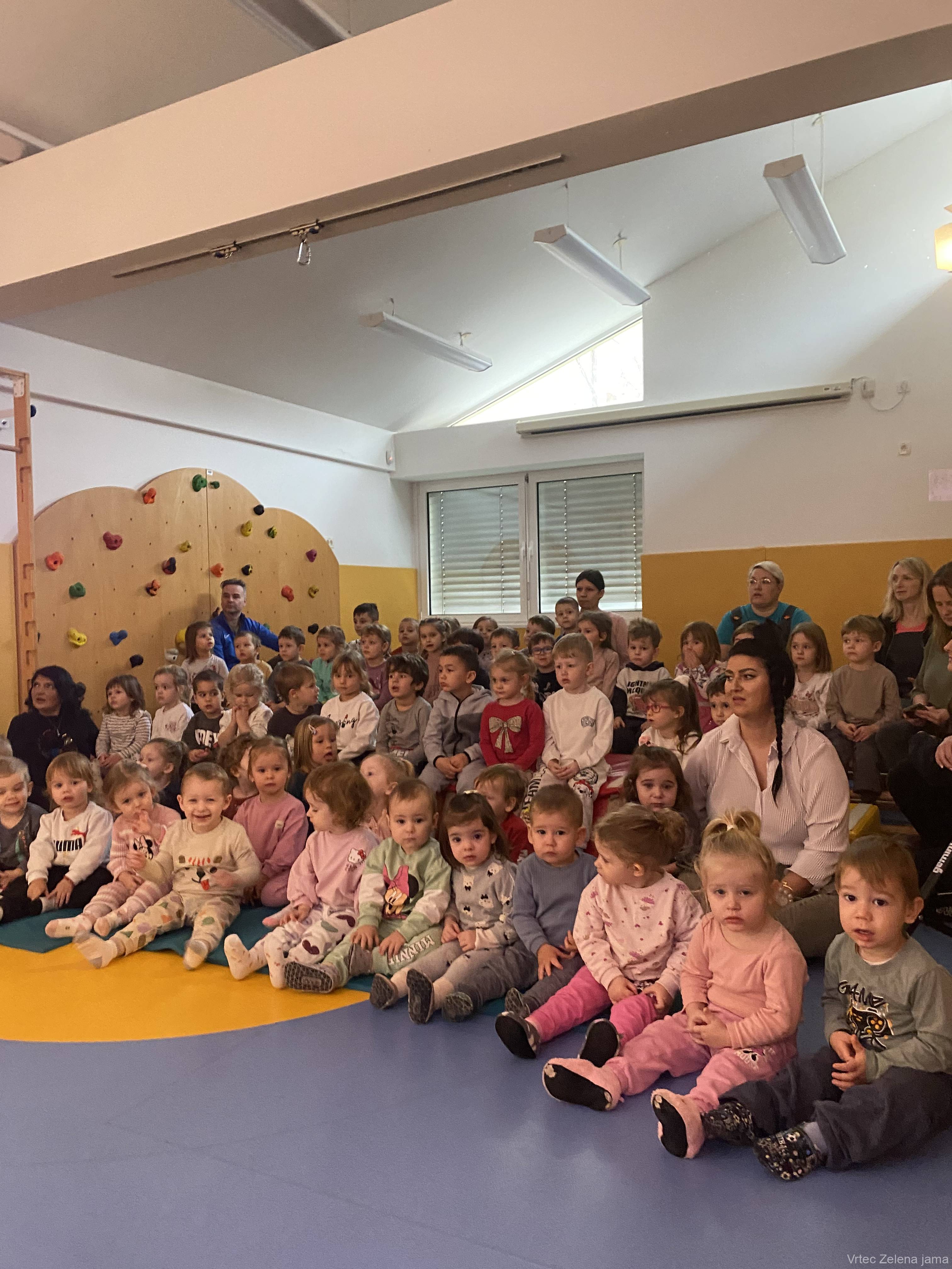 Mlajše skupine otrok so si v telovadnici Zmajčice, ogledale predstavo z naslovom "Žabec pozimi".