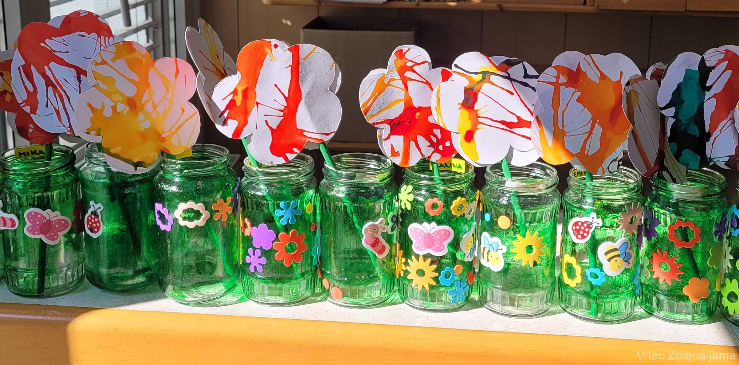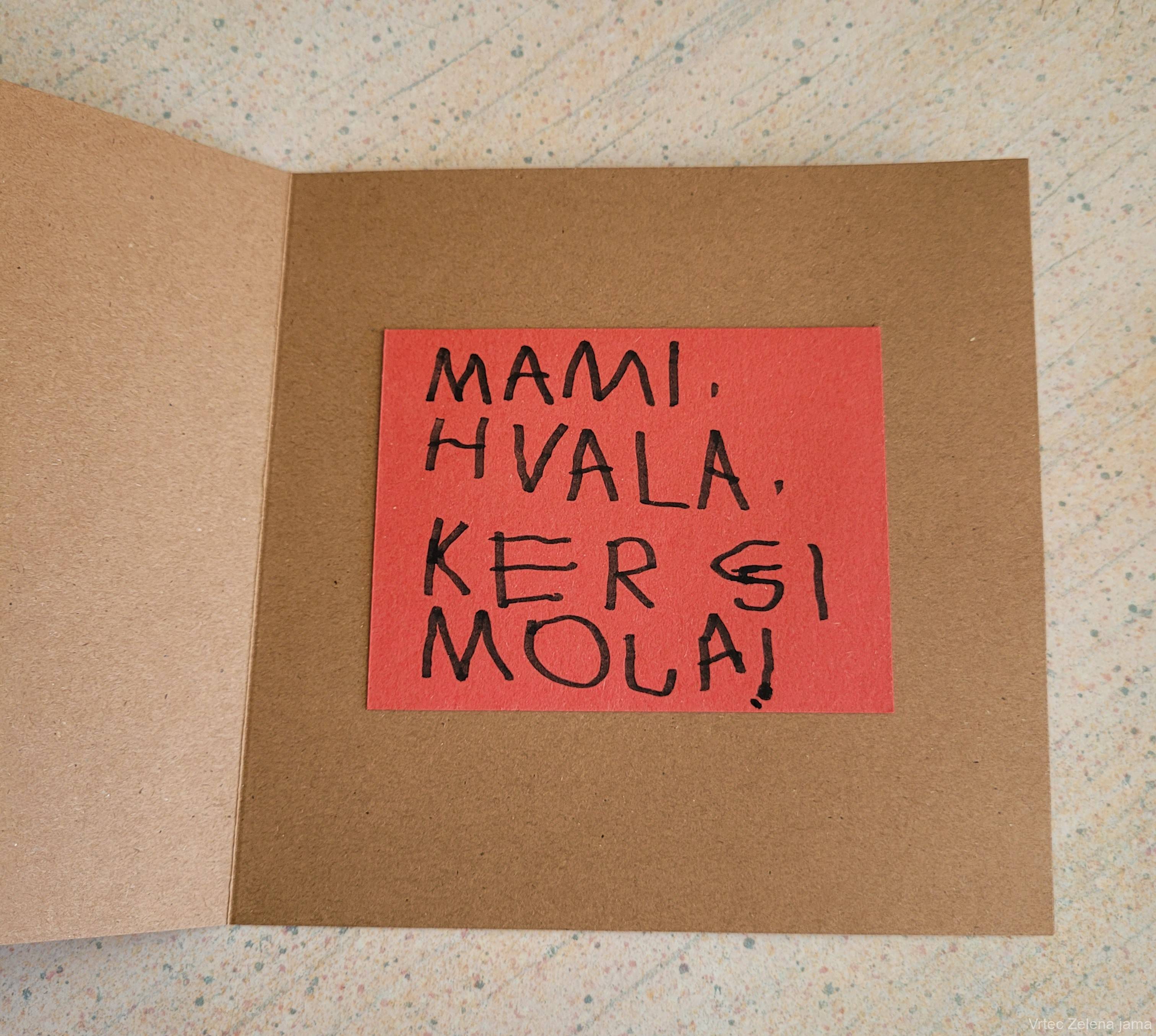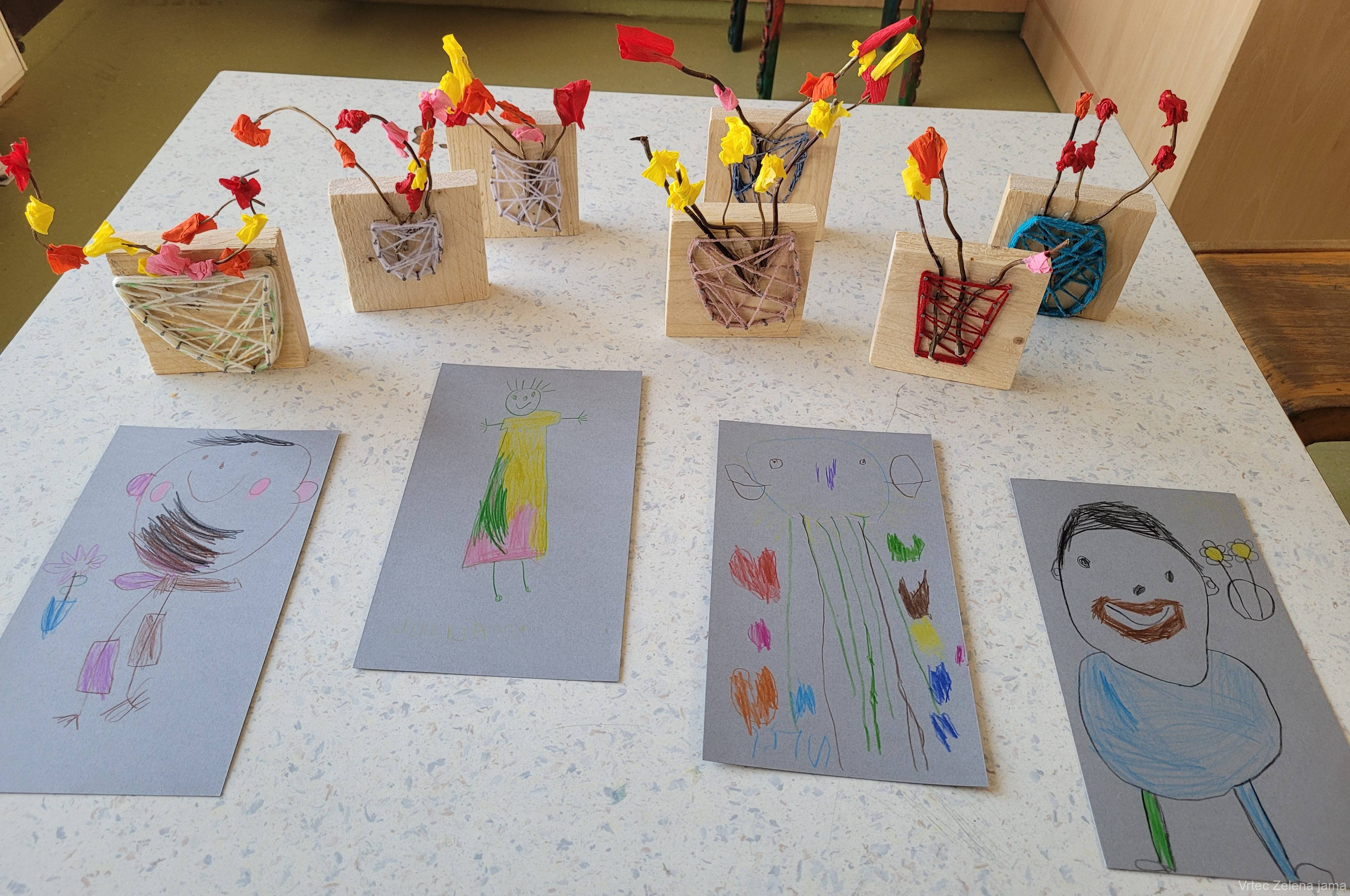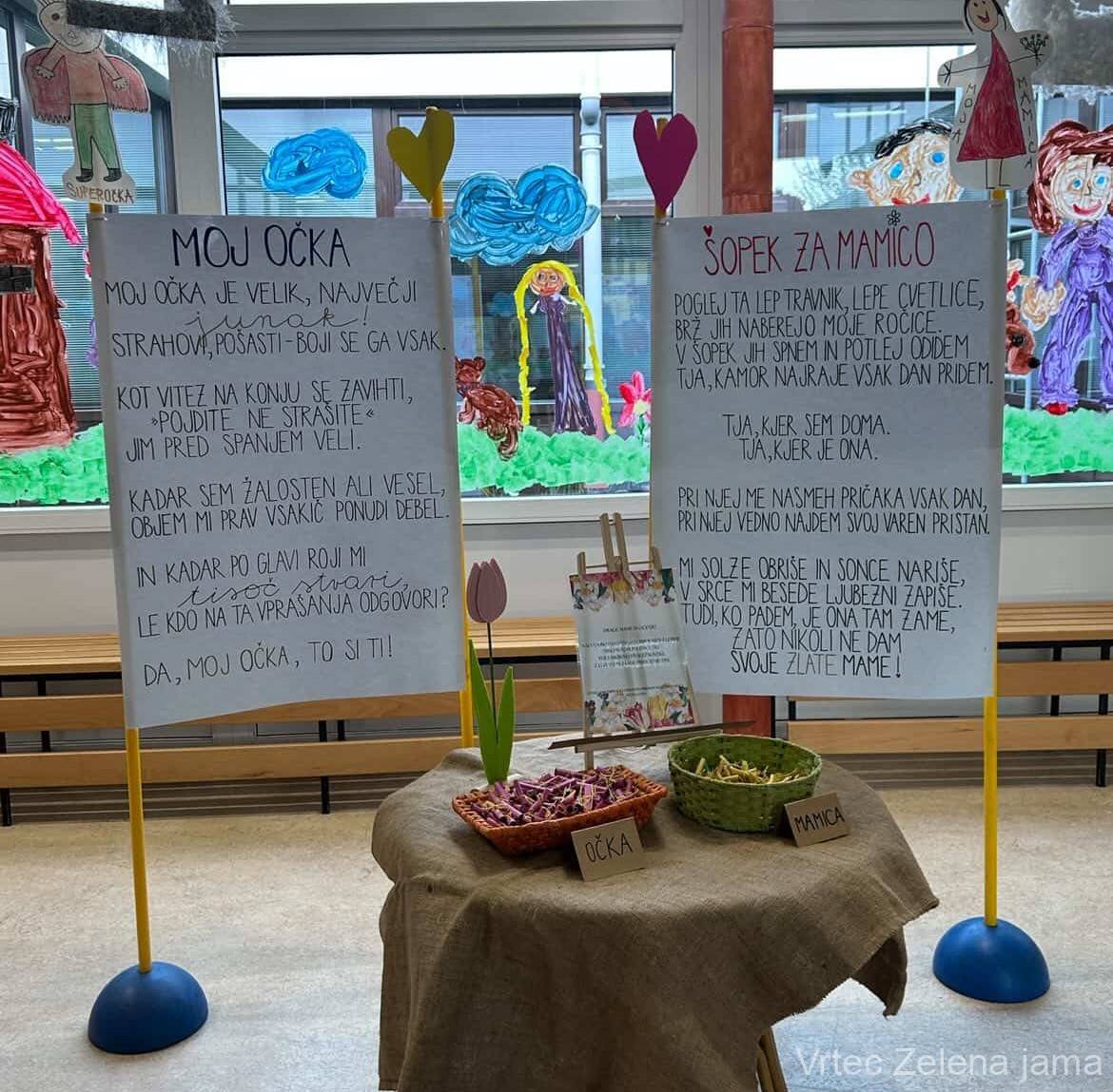 Ob današnjem materinskem dnevu smo v enoti Zelena jama pripravili prav posebno presenečenje za mamice in očke. V avli vrtca smo uredili stojnico, kjer so si starši lahko vzeli drobna posvetila, ki so jih z veliko iskrenosti in topline pripravili otroci. Vsaka misel je bila nekaj posebnega – preprosta, a iz srca.