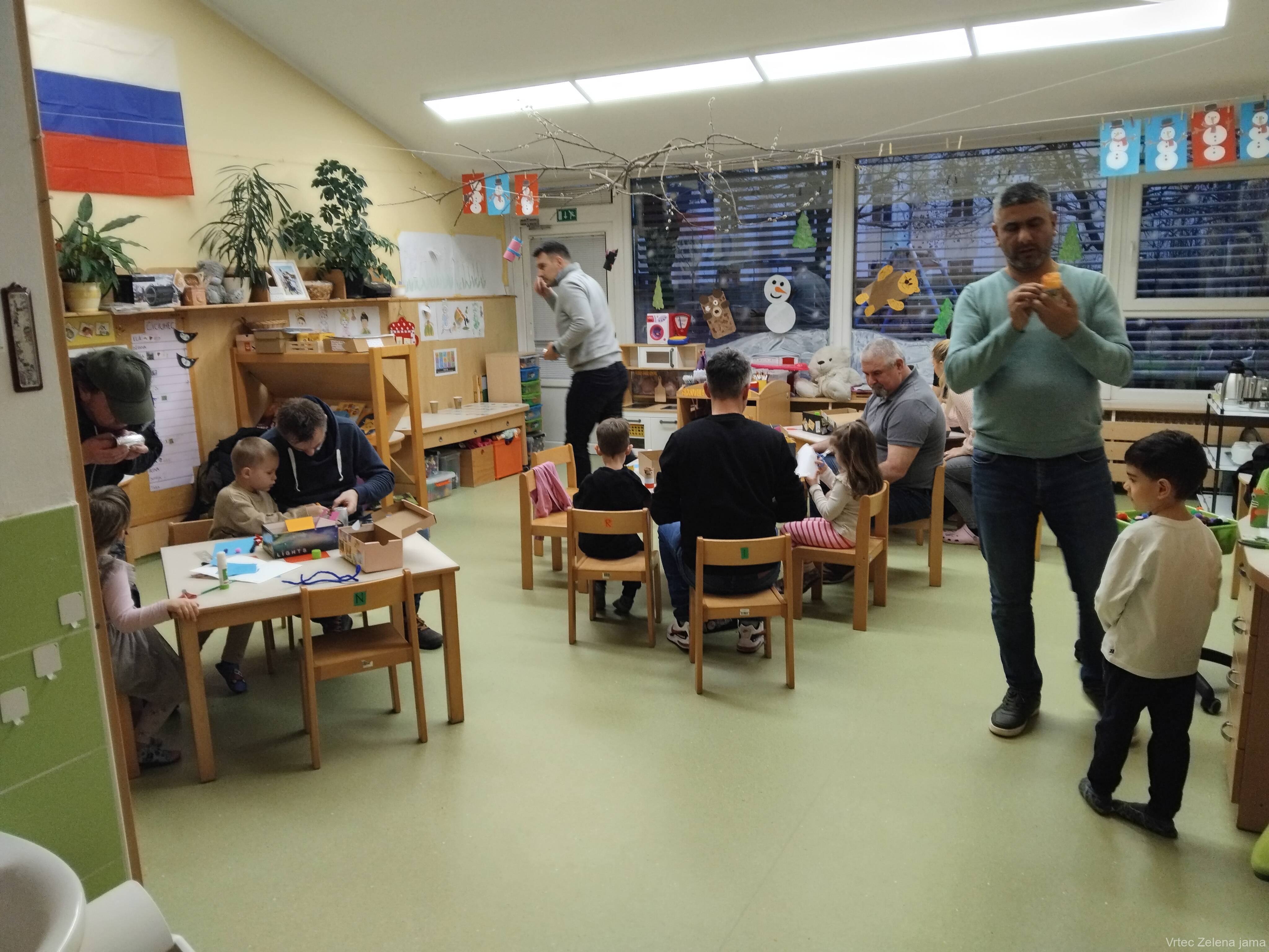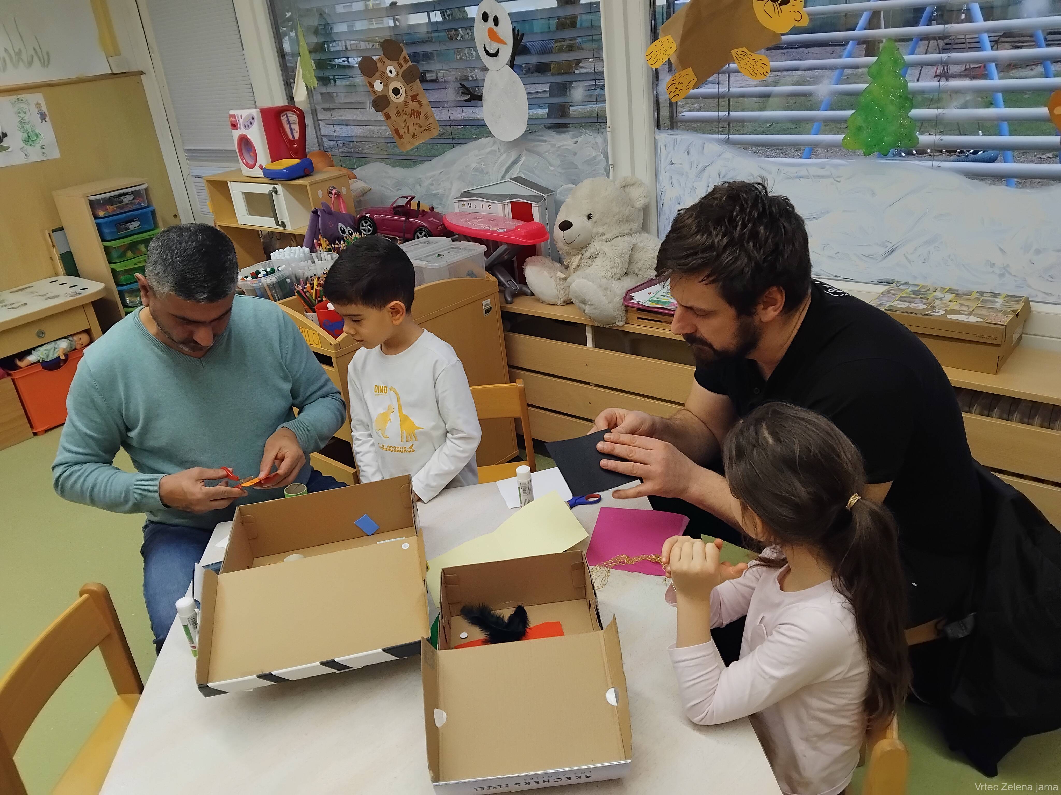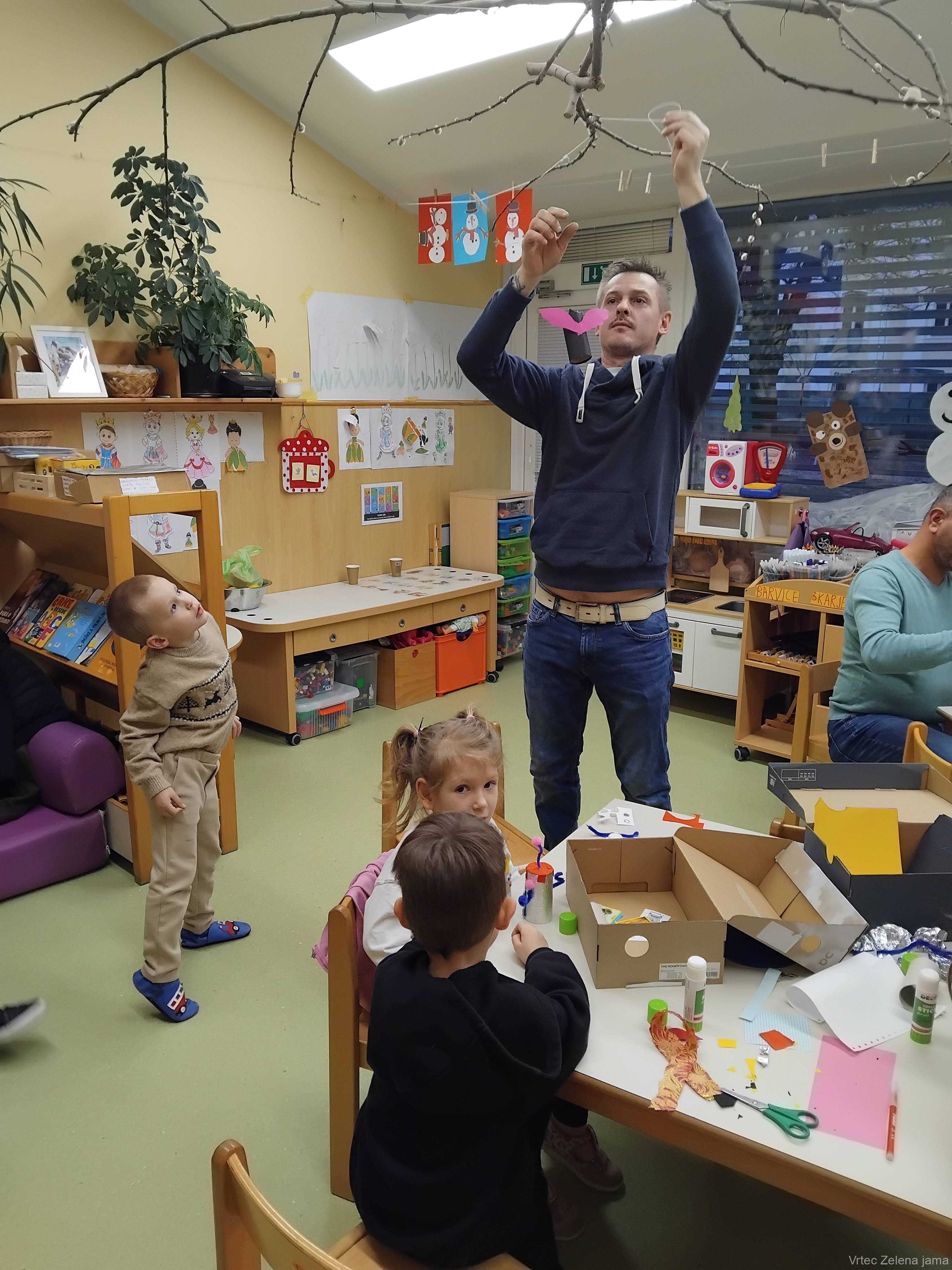 V sredo je bilo v skupini Lučke še posebej živahno, saj so se jim v popoldanskem času na delavnicah pridružili očki. Skupaj so izdelovali pustne maske, ki so jih izobesili po igralnici in si zaželeli, da bi nam pomagale pri odganjanju zime. Ob ustvarjanju jim ni manjkalo dobre volje, iznajdljivosti in otroške igrivosti, ki so jo otroci čisto spontano prenesli tudi na svoje očke.
