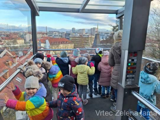 V petek, 18. 12. 2025, sta se skupini Klobučki in Sončnice iz enote Zelena jama z vzpenjačo odpravili na Ljubljanski grad. Tam so si otroci ogledali razstavo Punčke iz cunj ter prostorsko projekcijo Ko ilustracije oživijo. Po ogledu so se še sprehodili po grajskem dvorišču in okolici gradu.